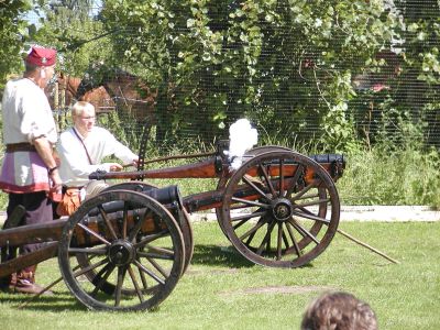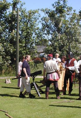 Der Trubel auf dem zum Ritterspielgelände umdekorierten Golfplatz ist gigantisch. Für 11.30 Uhr ist eine Begrüßungs-Artillerieschießen angesetzt. Es fällt der erste Schuss, und nur Sekunden später ist der Bauer von nebenan zur Stelle und reklamiert den Lärm im Auftrag seiner Pferde. Es wird eine Weile hektisch herumtelefoniert, dann scheint sich eine Lösung zu finden. Und ich komme in Konflikte: ich soll mir während der Kanonaden die Ohren zuhalten - aber wie bitteschön bediene ich dann meine Kamera?! Ich riskiere es und ertaube nicht, obwohl es doch ganz schön kracht. Wegen der Luntenzündung weiß man blöderweise nie, wann und ob der Schuss tatsächlich losgeht, und deshalb verreiße ich eine Menge Bilder.