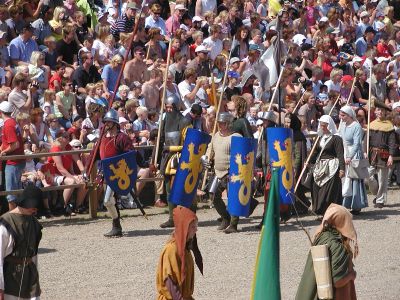 Wir sichern uns beste Plätze für die Arena und das Rittertournier. Es wird gehauen, gestochen und gefochten. Zwei Gruppen von jeweils drei Rittern nebst Fußvolk treten gegeneinander an, Gaukler unterhalten das Publikum, aber wir bekommen mangels ausreichenden Schwedischkenntnissen nicht alle Gags auf Anhieb mit. Trotzdem: Mordsgaudi!