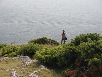 An der Spitze dieser Halbinsel finden wir dann eine eindrucksvolle Steilküstenlandschaft aus ziemlich schroffen Gneisfelsen - allerdings erst, nachdem wir wieder über eine Art felsiger Kuhweide gelatscht sind, auf der Bio-Tretminen in allen Größen, Farben, Formen und Erhaltungsgraden liegen. Annett findet sich mit ihrem Schicksal ab, und der Ausblick entschädigt für vieles. Da die Kondition jetzt langsam in den Keller rutscht, schleppen wir uns zurück zum Auto und kommen rechtzeitig zu "Enterprise" im Häuschen an.